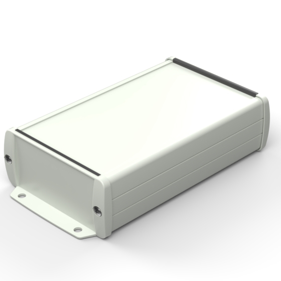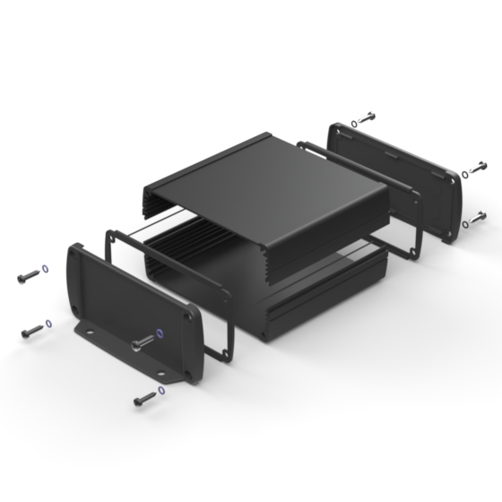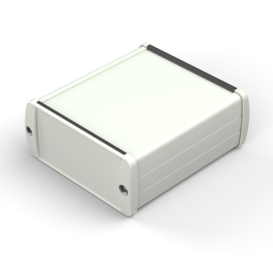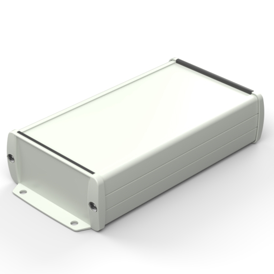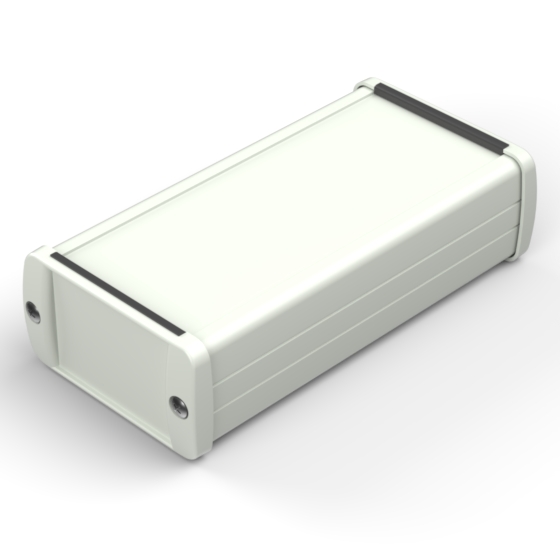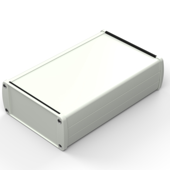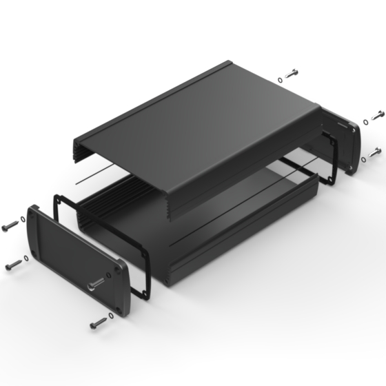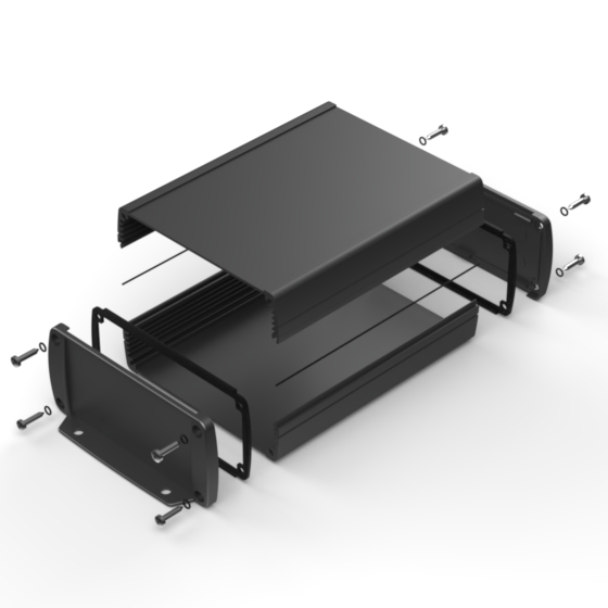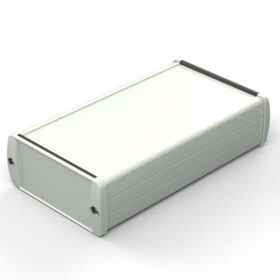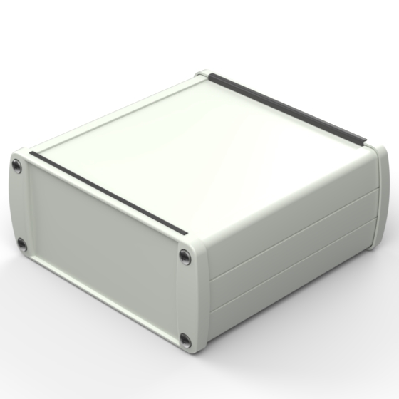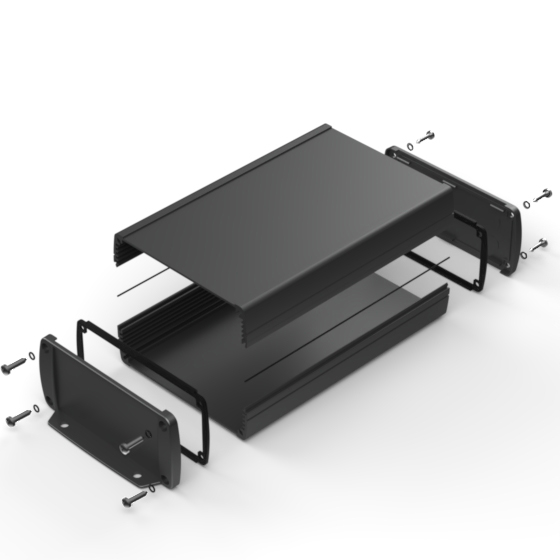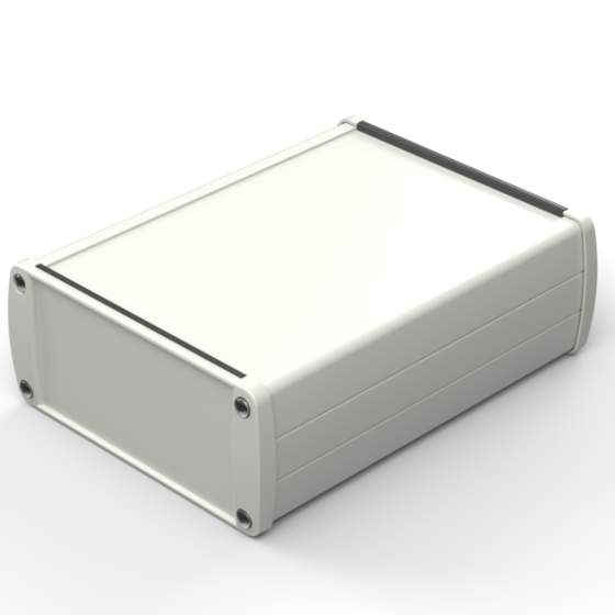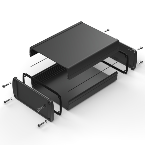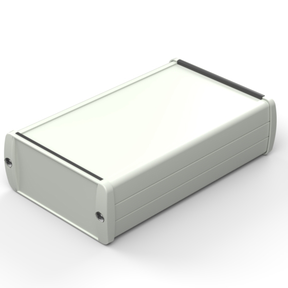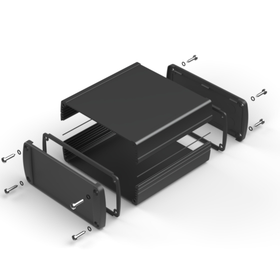 Profilgehäuse aus eloxiertem Aluminium mit oberflächiger Pulverbeschichtung. Zwei Metall- Abschlußdeckel, Dichtung-Sets für IP-65 Schutzart in sechs Farbenmöglichkeiten erhältlich, integrierte Führungsrippen für PCB und eingelassene Oberfläche zur Aufnahme einer Tastatur. Die Modelle mit „E“ haben Metall-Frontlaschen zur Wandbefestigung. Montage mit vier oder acht Schrauben.