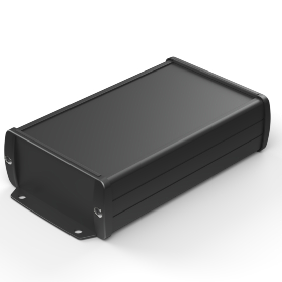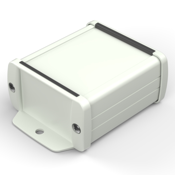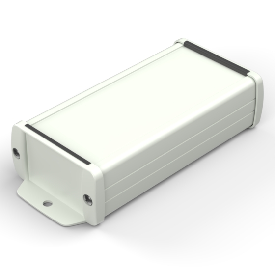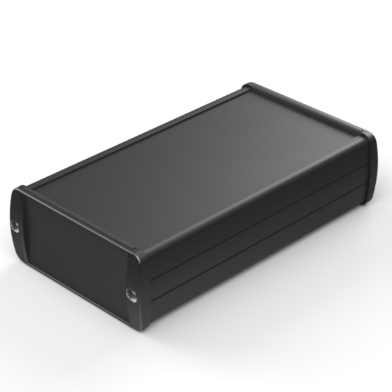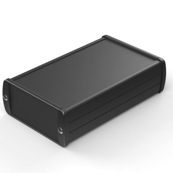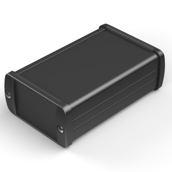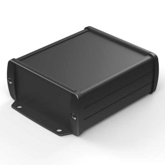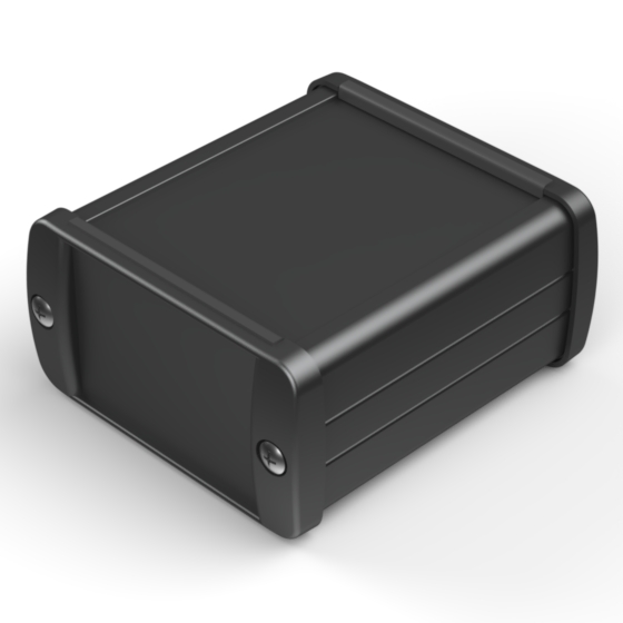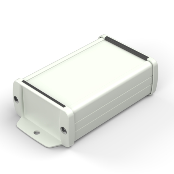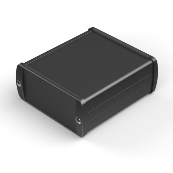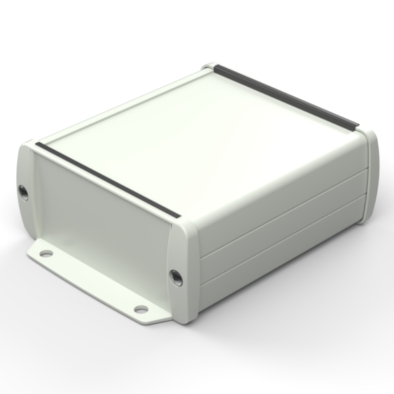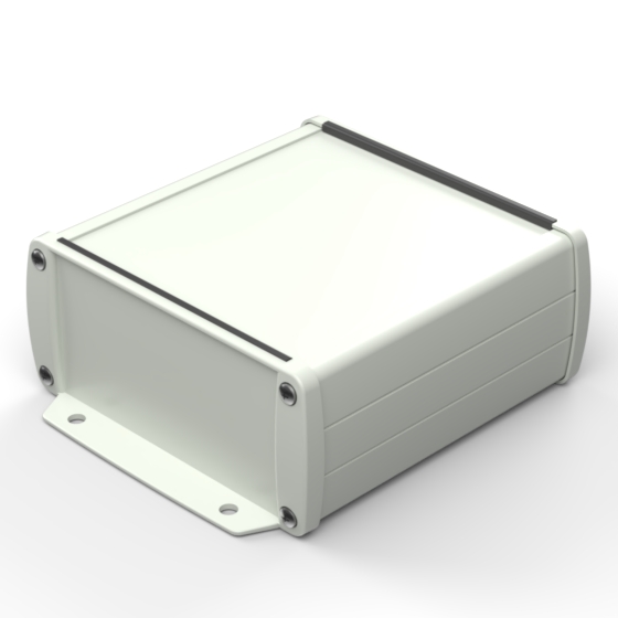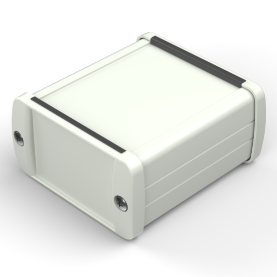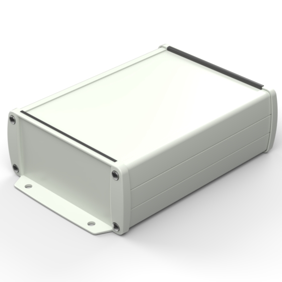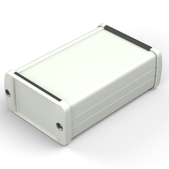 Profilgehäuse aus eloxiertem Aluminium mit oberflächiger Pulverbeschichtung. Zwei Metall- Abschlußdeckel, Dichtung-Sets für IP-65 Schutzart in sechs Farbenmöglichkeiten erhältlich, integrierte Führungsrippen für PCB und eingelassene Oberfläche zur Aufnahme einer Tastatur. Die Modelle mit „E“ haben Metall-Frontlaschen zur Wandbefestigung. Montage mit vier oder acht Schrauben.