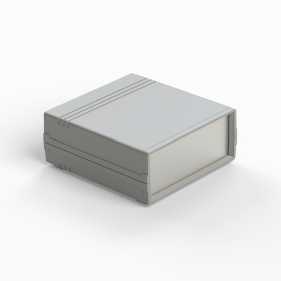 Kunststoffgehäuse mit zwei 1 mm starken Aluminiumdeckplatten. Jede Hälfte hat integrierte Führungen und Montagepfeiler für PCB. Matte Oberfläche. Montage mit nur 2 Schrauben. Front- und Rückplatte auch in hellgrauen ABS (Farbenkod .13) erhältlich. Version mit Plastikplatte: 011P, 012P, 022P, 222P, 223P, 233P.