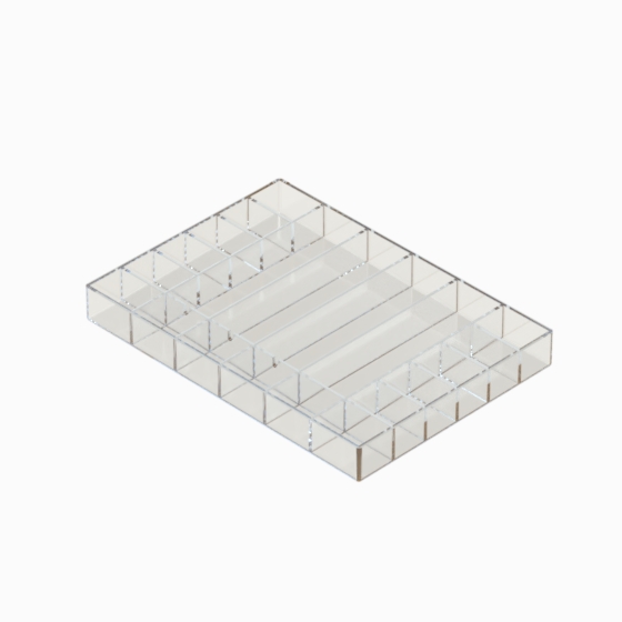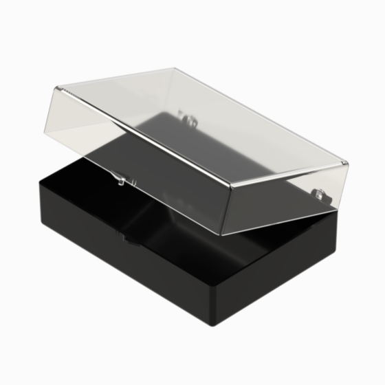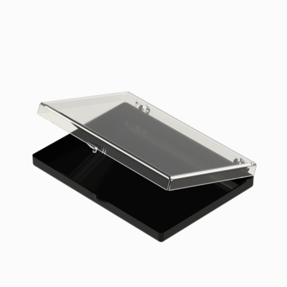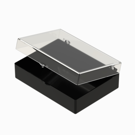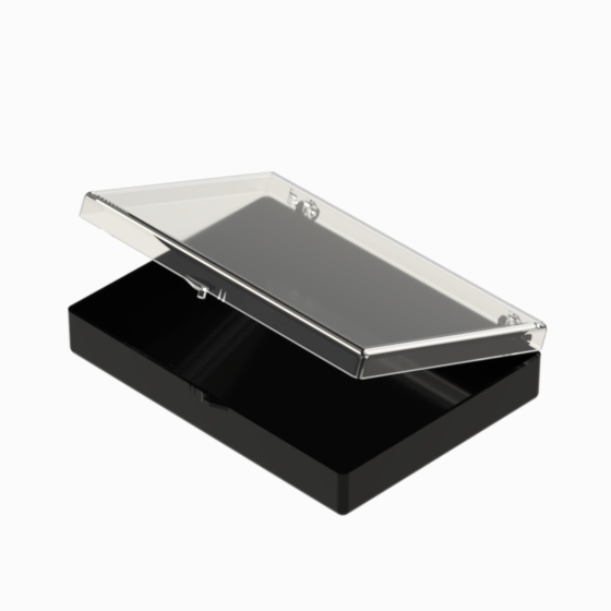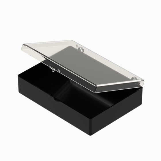 Aufbewahrungsboxen mit transparentem Klappdeckel und schwarzem Boden gefertigt. Die Boxen können mit bis drei Einlagen bestückt werden, die in 20, 28 oder 36 Felder aufgeteilt sind (Mod. SCA). Sie sind aus Polystyrol mit glänzender Oberfläche gefertigt.
