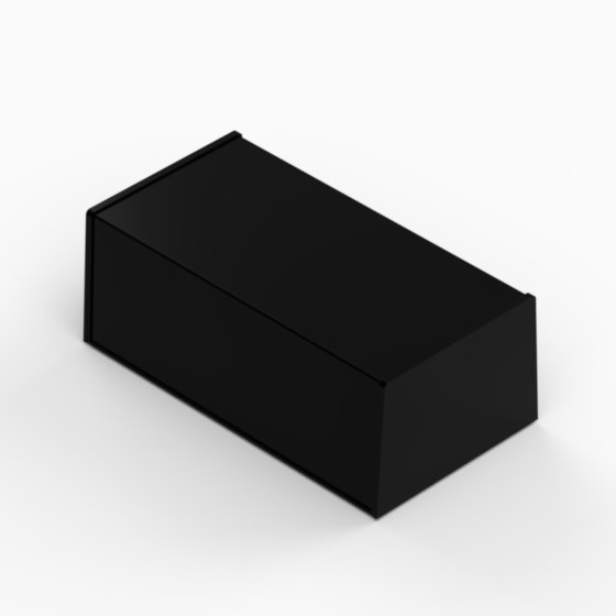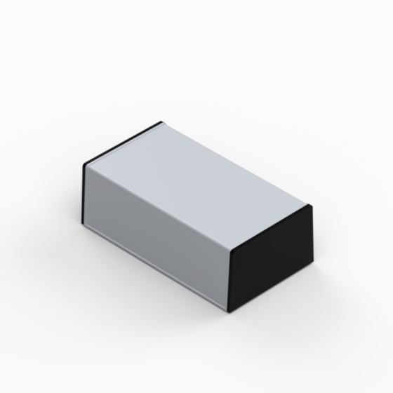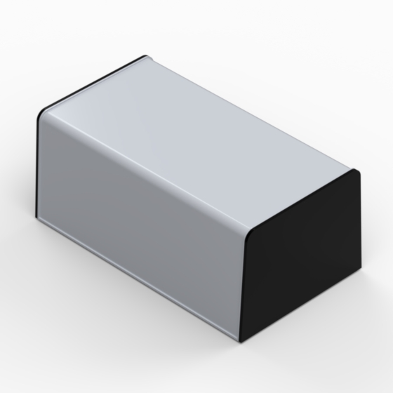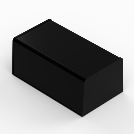 Kunststoffgehäuse mit zwei zusammenschnappbaren Hälften (1 Unterteil / 1 Deckeloberteil) einfarbiger (schwarz) oder zweifarbiger Ausführung. Das Unterteil ist immer schwarz und hat integrierte Führungen und Montagepfeiler für PCB. Zur Montage sind keine Schrauben nötig.