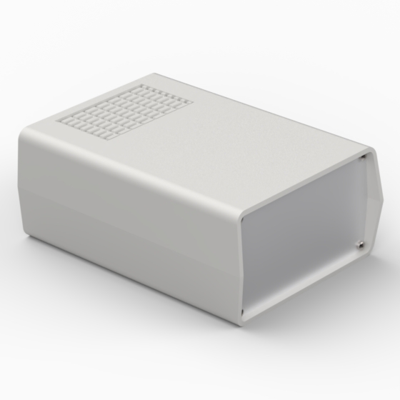 ABS enclosures with a vented cover and base for aeration. Front and rear 1 mm aluminium panels. Each half-shell has integral PCB guides and mounting studs. Matt surface finish. Closing by eight screws.