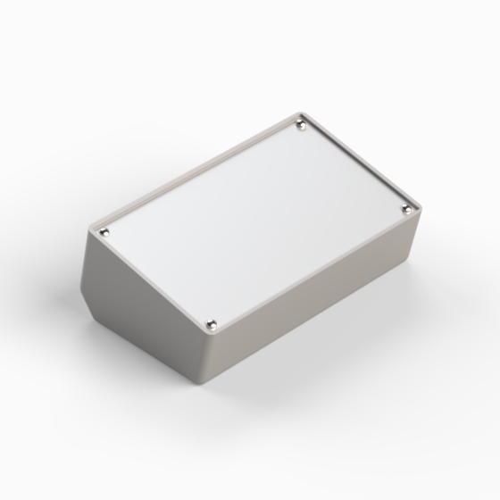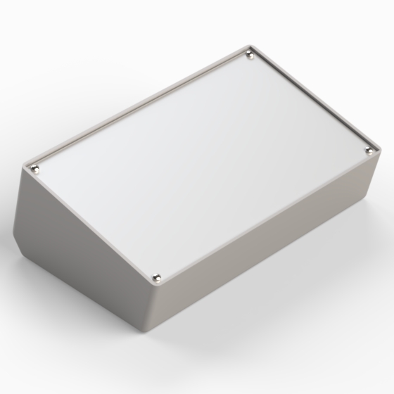 ABS enclosure with a 15° inclined 1mm aluminium panel. The base walls have integral PCB guides and mounting studs. Rounded corners. Glossy surfaces finish. Closing by four screws.