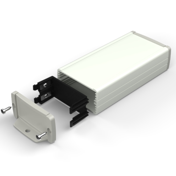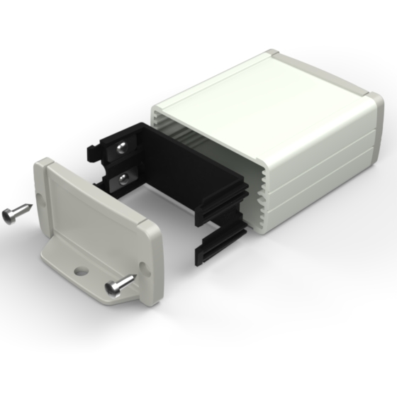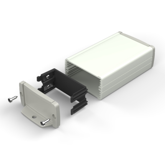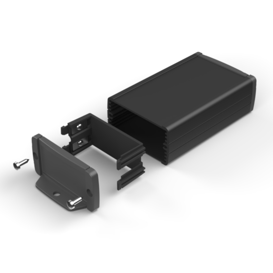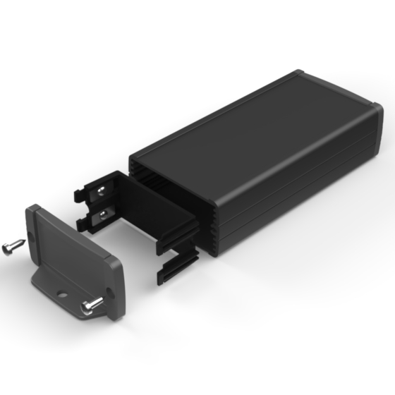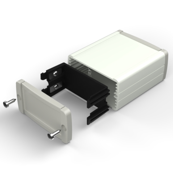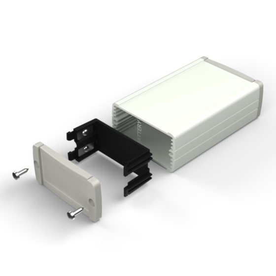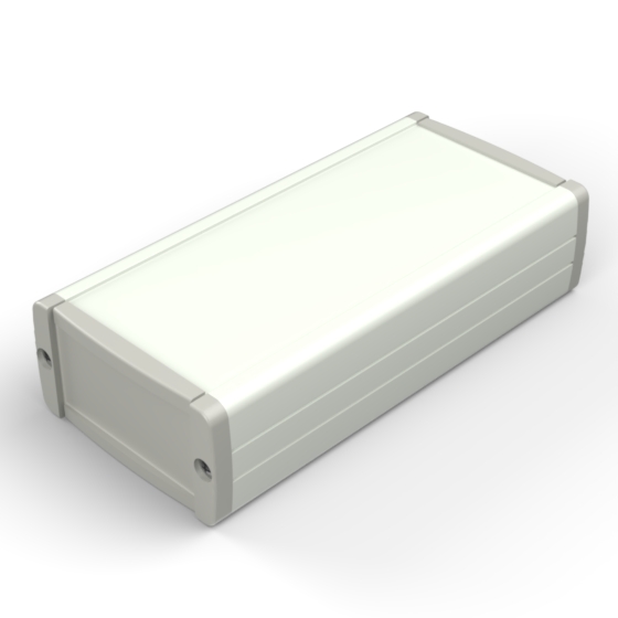 Boîtier en aluminium extrudé avec une haute qualité du finissage extérieur. Deux couvercles en ABS, guides internes pour circuit imprimé et partie supérieure avec décrochement pour clavier à membrane. Les modèles référencés «-B» ont un logement pour deux piles à 1,5V (AA) ou une pile à 9V (PP3). Douze modèles à disposition avec dimensions différentes. Montage par quatre vis.