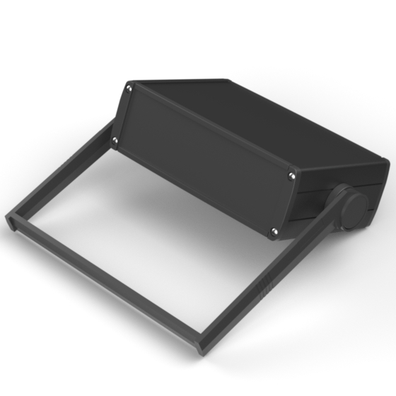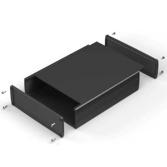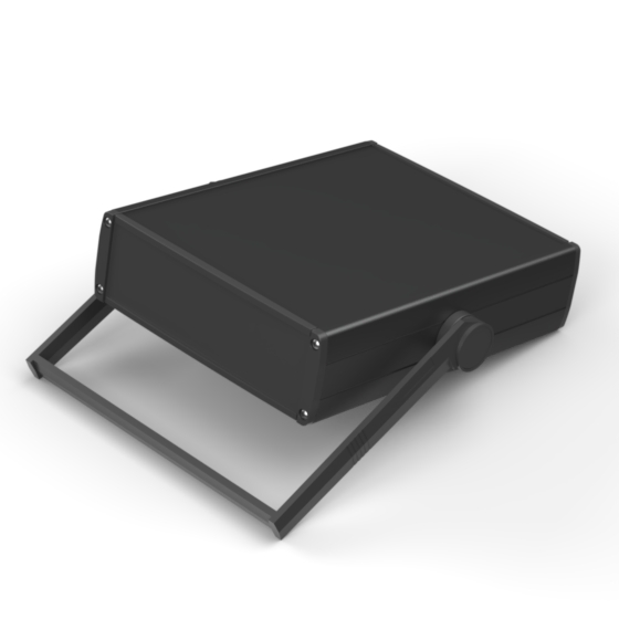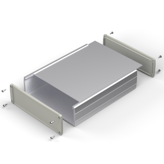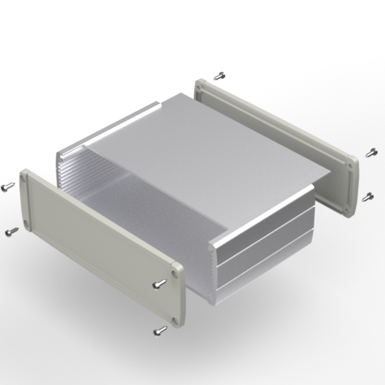 Boîtiers en aluminium extrudé avec une haute qualité du finissage extérieur. Couvercle supérieur à glissière toujours en aluminium. Deux couvercles en ABS, guides internes pour PCB. Les modèles référencés «-H» ont un poignée ergonomique réglable à huit positions. Deux longueurs différentes à disposition. Montage par huit vis.